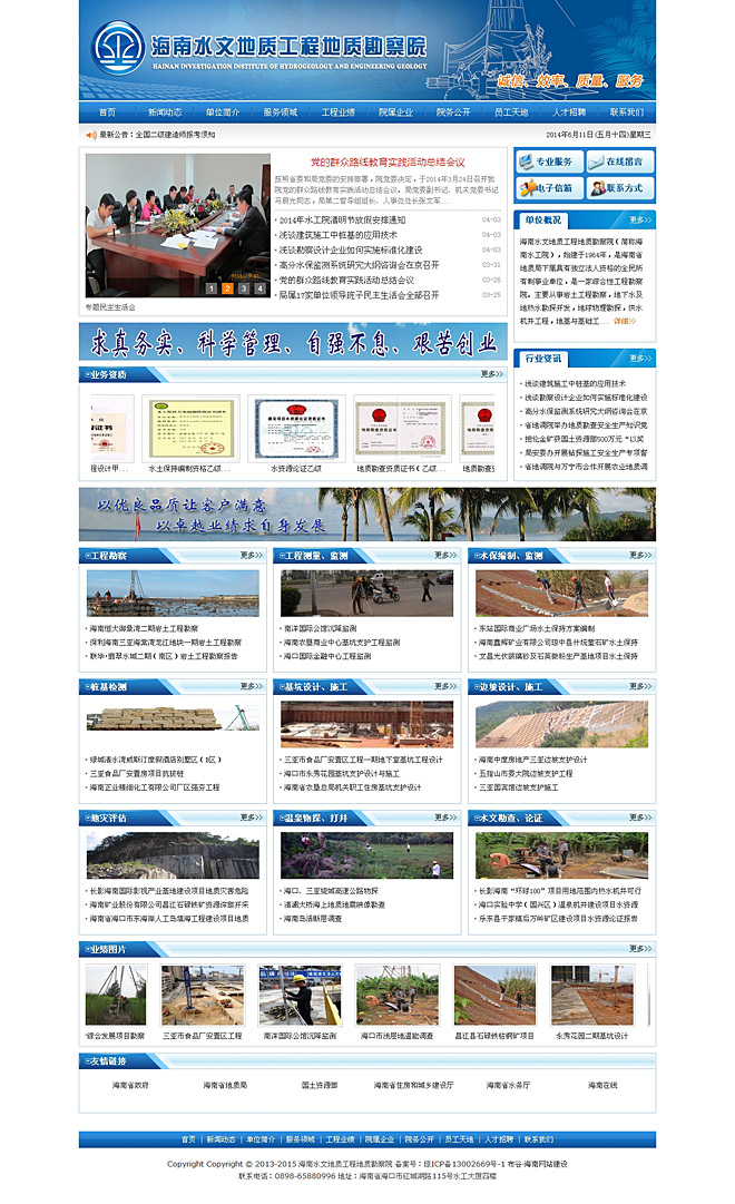 海南水文地質(zhì)工程地質(zhì)勘察院(簡稱海南水工院),始建于1964年, 是海南省地質(zhì)局下屬具有獨(dú)立法人資格的全民所有制事業(yè)單位,是一家綜合性工程勘察院。主要從事巖土工程勘察,地下水及地?zé)崴碧介_發(fā),地球物理勘探,供水機(jī)井工程,地基與基礎(chǔ)工程,市政工程,邊坡錨固工程,水利與環(huán)保工程的施工,地形測量,樁基檢測,巖土工程測試,地質(zhì)災(zāi)害危險性評估及勘查、設(shè)計、施工,水土保持方案編制與監(jiān)測等工作。持有建設(shè)部頒發(fā)的工程勘察綜合類甲級資質(zhì)證書;國土資源部頒發(fā)的地質(zhì)災(zāi)害治理工程勘查、設(shè)計、施工甲級證書及地質(zhì)災(zāi)害危險性評估甲級證書,水工環(huán)地質(zhì)勘查甲級,液體礦產(chǎn)勘查甲級,固體礦產(chǎn)勘查,地質(zhì)鉆探乙級資質(zhì)證書;水利部頒發(fā)的水土保持方案編制乙級及水土保持監(jiān)測乙級;海南省水務(wù)局頒發(fā)的建設(shè)項(xiàng)目水資源論證乙級資質(zhì)證書等。2006年獲得ISI9001:2000質(zhì)量管理體系認(rèn)證。
