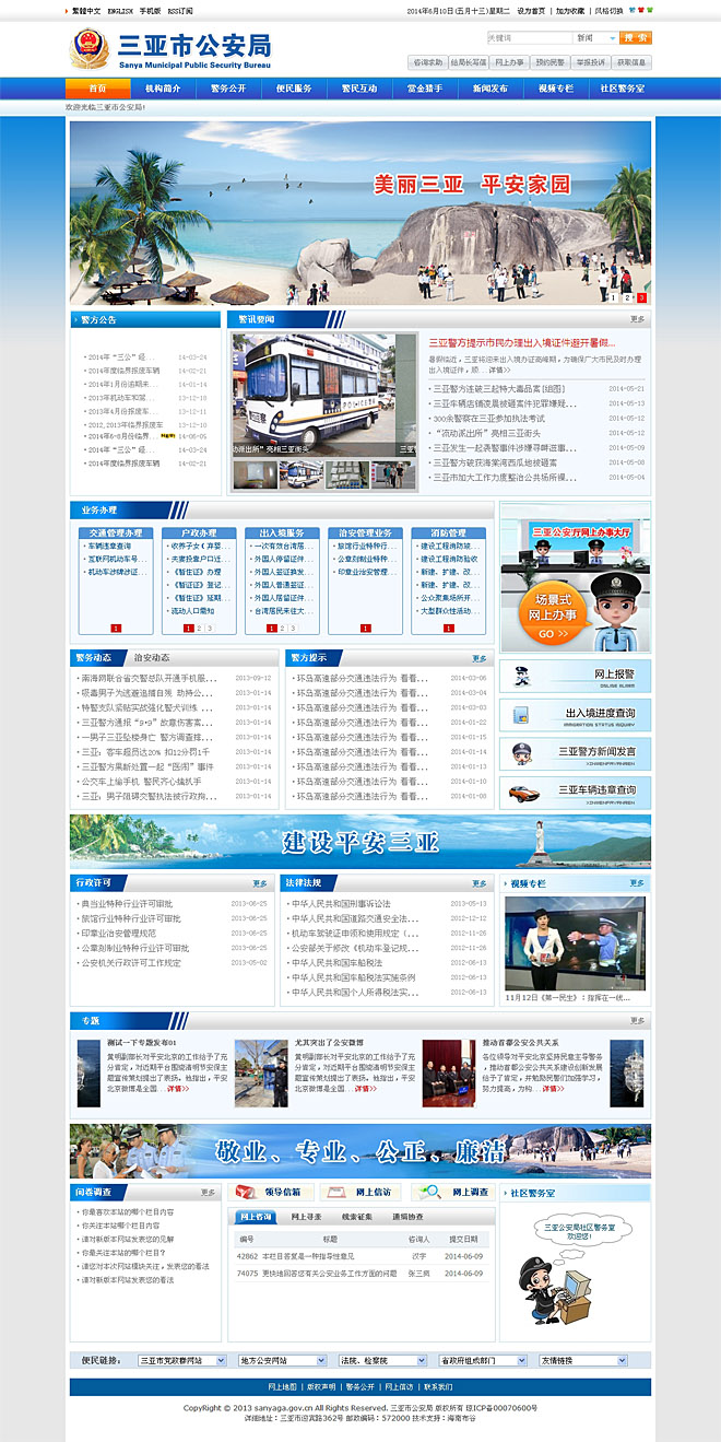 三亞市公安局是三亞市人民政府下設(shè)主管全市公安工作的職能部門,受市政府、海南省公安廳雙重領(lǐng)導(dǎo)。各縣(縣級市)區(qū)設(shè)公安局(分局),在鎮(zhèn)、鄉(xiāng)、街道設(shè)派出所;公安分局與派出所分別接受同級人民政府和上級公安機關(guān)領(lǐng)導(dǎo)。