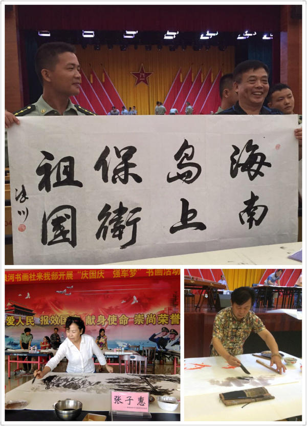 經(jīng)過約一個半小時的路程,大家到達(dá)了今天活動目的地-省軍區(qū)某部,部隊(duì)首長和人民子弟兵早早的在機(jī)關(guān)辦公樓前列隊(duì)等候萬泉河書畫社的各位書畫家老師們,爾后,部隊(duì)首長致歡迎辭,董德川社長講話和進(jìn)行書畫作品贈送儀式。集體合影結(jié)束后大家觀看匯報(bào)片并參觀辦公樓、參觀部隊(duì)文化活動中心與官兵交流進(jìn)行指導(dǎo)