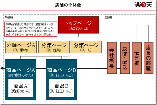 舉例來說,利用樂天RMS的Storefront來搭建一個店鋪的架構(gòu)如下,橫向可以分為店鋪和商品維度,縱向的商品軸又分為店鋪–類別–具體商品,店長可以按照這個架構(gòu)很方便地完成一個店鋪。